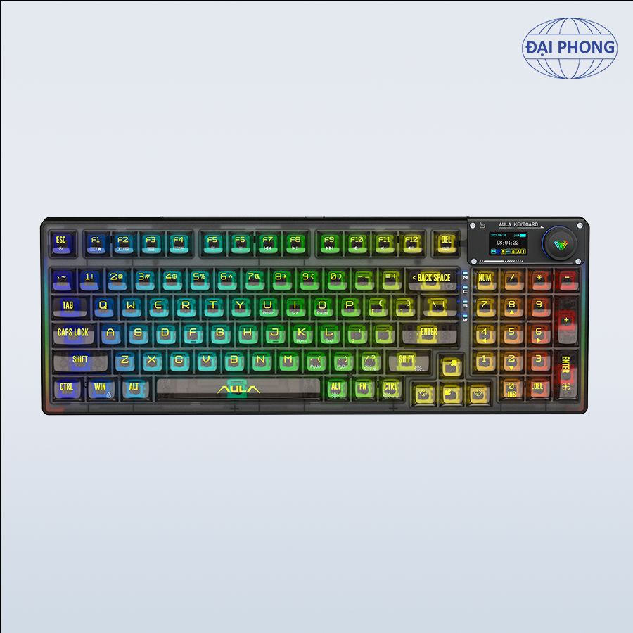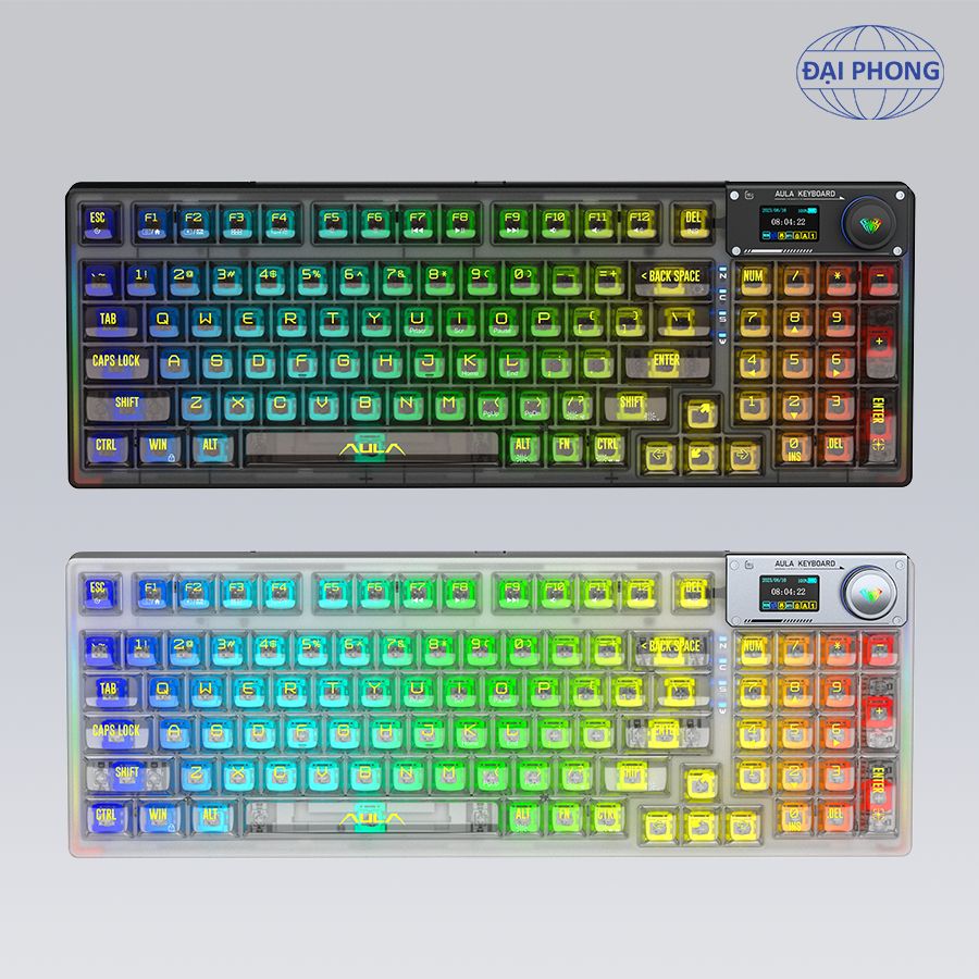 • Bàn phím cơ gaming 3 mode AULA F98 Pro• Độ bền phím: 60 triệu lần bấm• Kết nối: 3 mode có dây Type-C & không dây 2.4G & BT• Màu sắc: 2 màu đen trong suốt và trắng trong suốt• Keycap: Nhựa PC trong suốt• Đèn nền: LED RGB với 19 hiệu ứng ánh sáng• Loại switch: Ice crystal switch• Hiệu ứng âm thanh khi gõ phím: Linear• Hot-Swap 5 pin• Gasket mount• Núm xoay đa chức năng• Màn hình LED: Hiển thị thông tin và hình ảnh• Mạch: Ngược• Số lượng phím: 95 phím• Điện áp/dòng sạc: DC 5V/≦600mA• Điện áp định mức: DC 3.7V• Dung lượng pin: Pin Li-ion có thể sạc lại 4000mAh• Thời gian sử dụng khi sạc đầy pin: ≧ 19 giờ (hiệu ứng ánh sáng mặc định); ≧42 giờ (tắt đèn nền và đèn bên)• Trọng lượng: 1060g• Kích thước (L x W x H): 384,98 × 138,20 × 40,68 ± 0,5mm• Hệ điều hành tương thích: WIN XP7/8/10/Android/IOS/MAC• Phụ kiện kèm theo: Sách hướng dẫn sử dụng + 4 Switch tặng kèm + Dây USB type-C + Dụng cụ thay keycap + Bộ chổi và khăn vệ sinh bàn phím