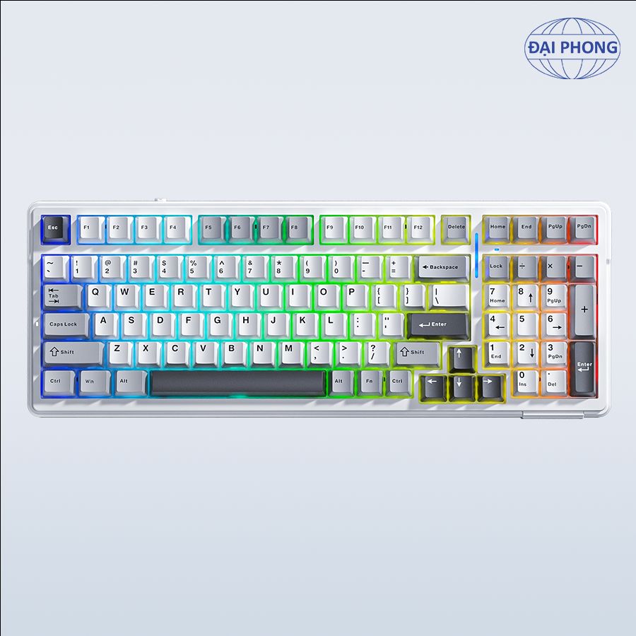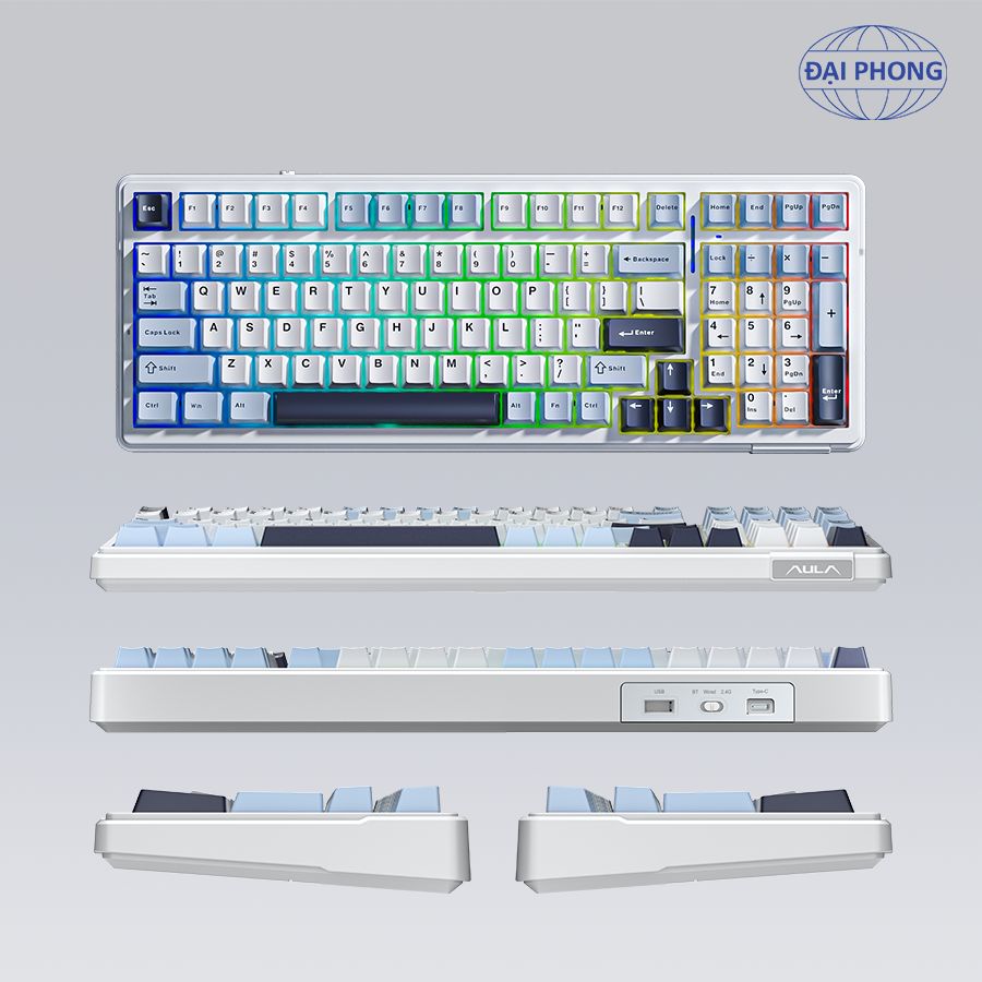 • Bàn phím cơ gaming 3 mode AULA F99• Độ bền phím: 60 triệu lần bấm• Thời gian sử dụng sau khi sạc đầy pin: Khoảng 53 giờ (hiệu ứng ánh sáng mặc định)/ 400 giờ (tất cả đèn tắt)• Kết nối: 3 mode có dây Type-C & không dây 2.4G & BT• Màu sắc: Màu xám + trắng + xám đậm• Đèn nền: LED RGB với 16 loại hiệu ứng ánh sáng• Loại switch: Gred wood V3 switch• Hiệu ứng âm thanh khi gõ phím: Linear• Hot swap• Gasket mount• Mạch ngược• Số lượng phím: 99 phím• Chất liệu keycap: Nhựa PBT• Trọng lượng: Khoảng 1132g (không có cáp/bộ thu)/ 1183g (với cáp/bộ thu)• Điện áp định mức: DC 3.7V (Đầy đủ 4.2V)• Dung lượng pin: Pin Li-ion có thể sạc lại 8000mAh (2x4000mAh)• Điện áp/Dòng điện sạc: DC 5V/≦830mA• Dòng điện định mức: 150mA @3.7V (hiệu ứng ánh sáng mặc định)/20mA (tắt tất cả đèn)• Kích thước bàn phím (L x W x H): 390,63 x 146,78 x 42,57 mm• Phụ kiện kèm theo: Sách hướng dẫn sử dụng + 2 switch tặng kèm + Dây USB type-C + Dụng cụ thay keycap