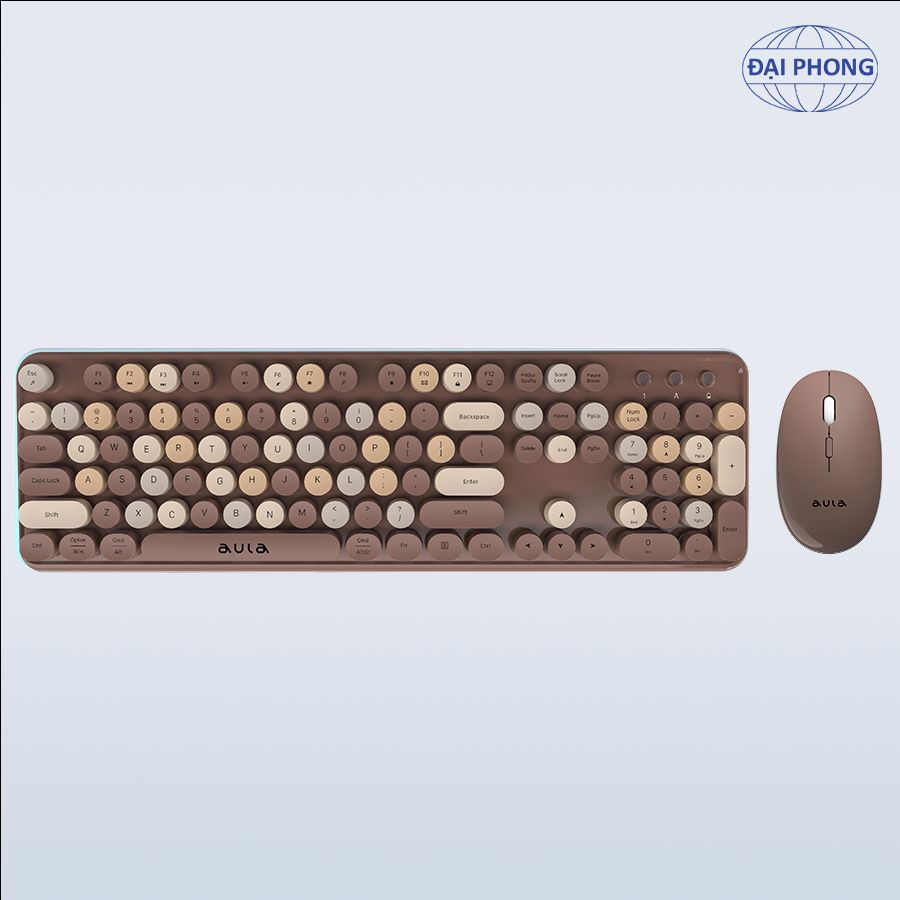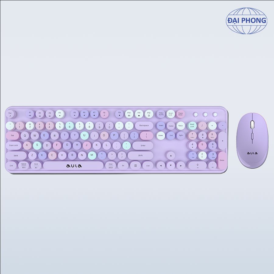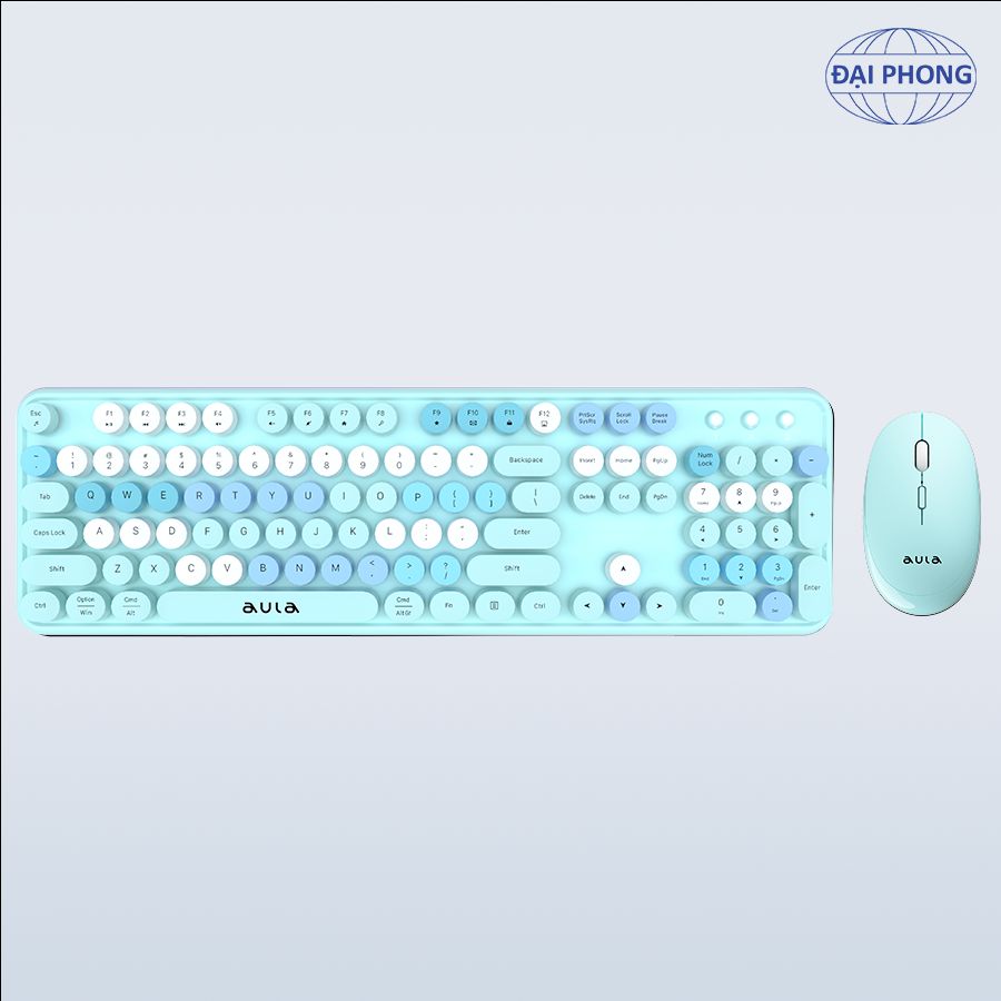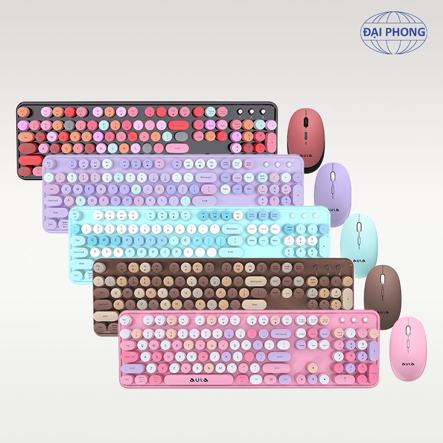 • Combo bàn phím và chuột không dây AULA AC306• - Thông số bàn phím: • Màu sắc: 5 màu black-colorful, blue-colorful, coffee-colorful, purple-colorful, pink-colorful • Kết nối: Không dây 2.4G • Số lượng phím: 104 phím • Chất liệu keycap: Nhựa ABS • Trọng lượng: 658g ± 5g • Kích thước bàn phím (LxWxH): 445 x 136 x 35 ±2 mm • Hệ điều hành tương thích: WIN XP/7/8/10/MAC • Phụ kiện kèm theo: Sách hướng dẫn sử dụng + chổi vệ sinh bàn phím + 2 pin • - Thông số chuột: • Màu sắc: 5 màu đen, xanh da trời, nâu, tím, hồng • DPI: 800-1000-1600DPI • Số lượng nút: 4 nút • Trọng lượng: 50g ± 5g • Kích thước chuột (D x W x H): 109 x 63 x 36 mm • Hệ điều hành tương thích: WIN XP/7/8/10/MAC